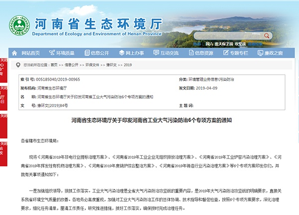 河南省生態(tài)環(huán)境廳關(guān)于印發(fā)河南省工業(yè)大氣污染防治6個專項方案的通知