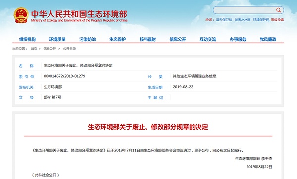 2019年8月22日,生態(tài)環(huán)境部發(fā)布關(guān)于廢止、修改部分規(guī)章的決定,詳情如下:
