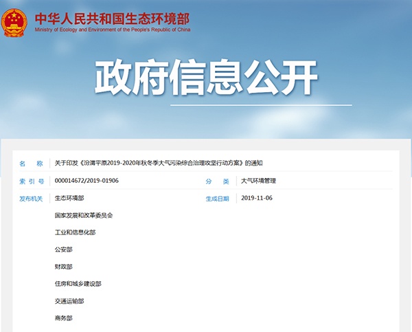 2019年11月6日,生態(tài)環(huán)境部聯(lián)合國家發(fā)展和改革委員會(huì)、工業(yè)和信息化部、公安部、財(cái)政部、住房和城鄉(xiāng)建設(shè)部等發(fā)布關(guān)于印發(fā)《汾渭平原2019-2020年秋冬季大氣污染綜合治理攻堅(jiān)行動(dòng)方案》的通知,詳情如下: