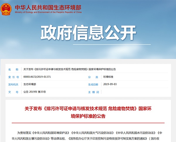 2019年9月3日,生態(tài)環(huán)境部發(fā)布《排污許可證申請與核發(fā)技術規(guī)范 危險廢物焚燒》,詳情如下: