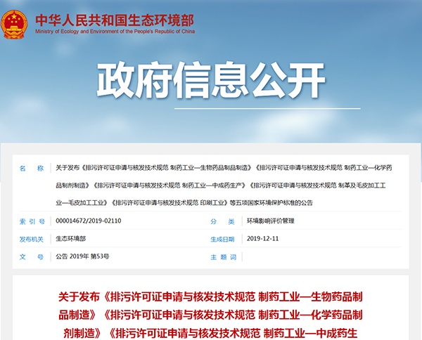 2019年12月11日,生態(tài)環(huán)境部發(fā)布《排污許可證申請與核發(fā)技術(shù)規(guī)范 制藥工業(yè)—生物藥品制品制造》《排污許可證申請與核發(fā)技術(shù)規(guī)范 制藥工業(yè)—化學(xué)藥品制劑制造》《排污許可證申請與核發(fā)技術(shù)規(guī)范 制藥工業(yè)—中成藥生產(chǎn)》《排污許可證申請與核發(fā)技術(shù)規(guī)范 制革及毛皮加工工業(yè)—毛皮加工工業(yè)》《排污許可證申請與核發(fā)技術(shù)規(guī)范 印刷工業(yè)》,詳情如下: