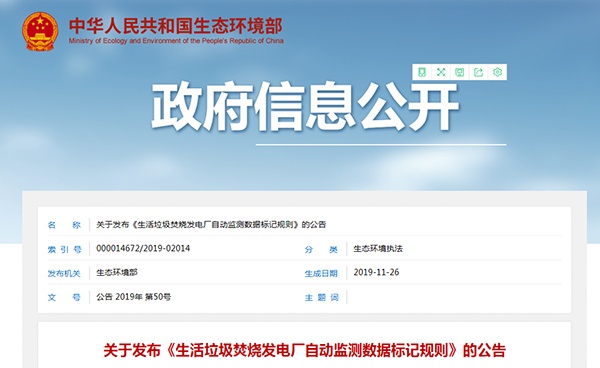 2019年11月26日,生態(tài)環(huán)境部發(fā)布了關(guān)于發(fā)布《生活垃圾焚燒發(fā)電廠自動(dòng)監(jiān)測(cè)數(shù)據(jù)標(biāo)記規(guī)則》的公告,詳情如下: