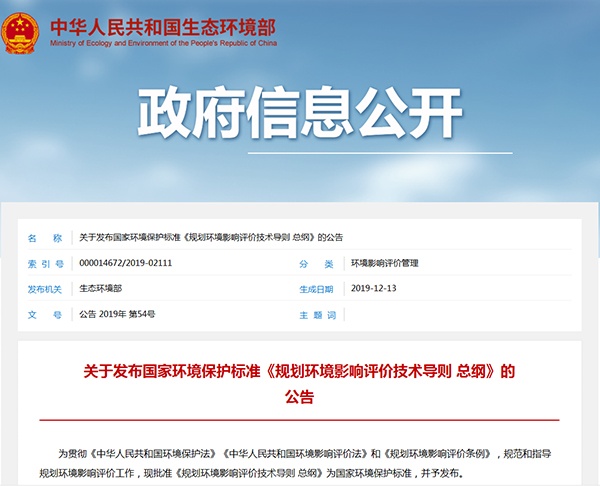 2019年12月13日,生態(tài)環(huán)境部發(fā)布了《規(guī)劃環(huán)境影響評價技術導則 總綱》(HJ130-2019),詳情如下: