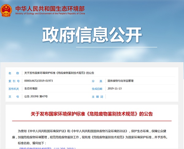 生態(tài)環(huán)境部關(guān)于發(fā)布國(guó)家環(huán)境保護(hù)標(biāo)準(zhǔn)《危險(xiǎn)廢物鑒別技術(shù)規(guī)范》的公告