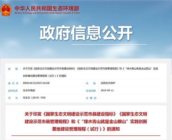 2019年9月11日,生態(tài)環(huán)境部印發(fā)《國家生態(tài)文明建設(shè)示范市縣建設(shè)指標》《國家生態(tài)文明建設(shè)示范市縣管理規(guī)程》和《“綠水青山就是金山銀山”實踐創(chuàng)新基地建設(shè)管理規(guī)程(試行)》,詳情如下: