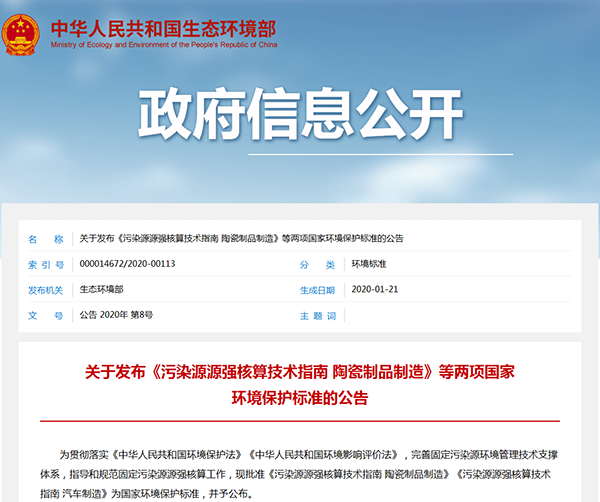2020年1月21日,生態(tài)環(huán)境部發(fā)布了《污染源源強(qiáng)核算技術(shù)指南 陶瓷制品制造》《污染源源強(qiáng)核算技術(shù)指南 汽車制造》兩項(xiàng)國家環(huán)境保護(hù)標(biāo)準(zhǔn),詳情如下: