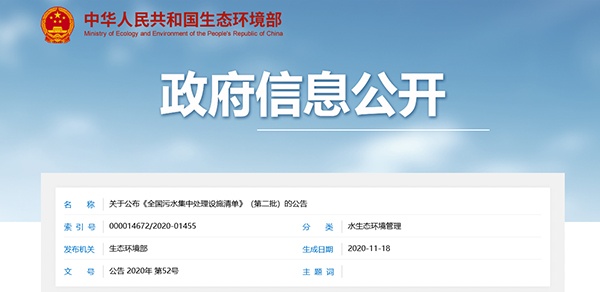 轉(zhuǎn)發(fā)生態(tài)環(huán)境部關(guān)于公布《全國污水集中處理設(shè)施清單》(第二批)的公告
