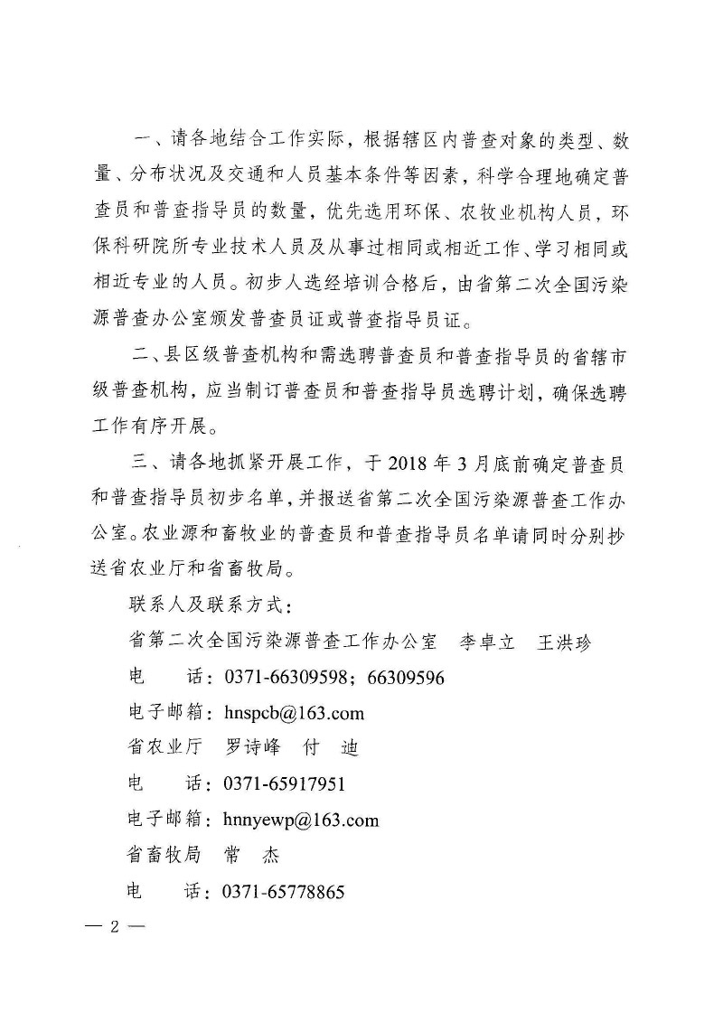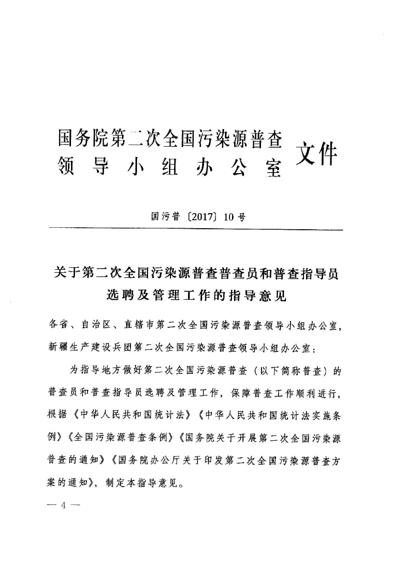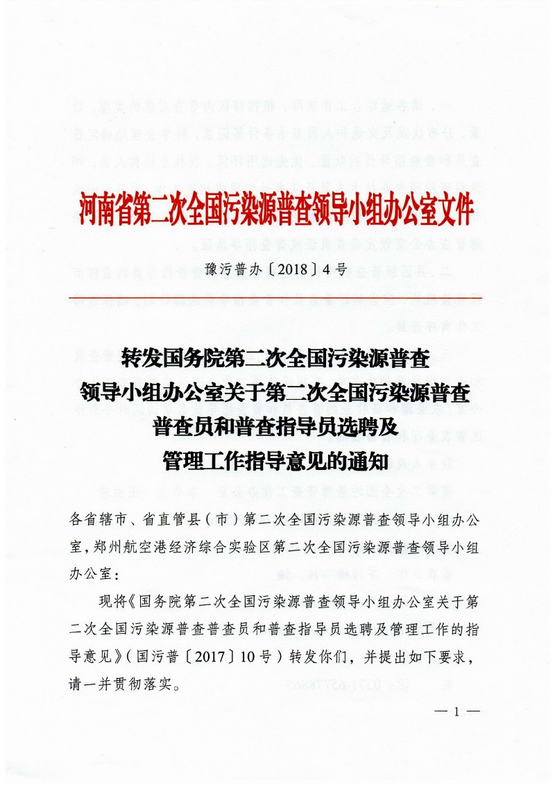 豫污普辦【2018】4號(hào)轉(zhuǎn)發(fā)國(guó)務(wù)院第二次全國(guó)污染源普查領(lǐng)導(dǎo)小組辦公室關(guān)于第二次全國(guó)污染源普查普查員和普查指導(dǎo)員選聘及管理工作指導(dǎo)意見(jiàn)的通知